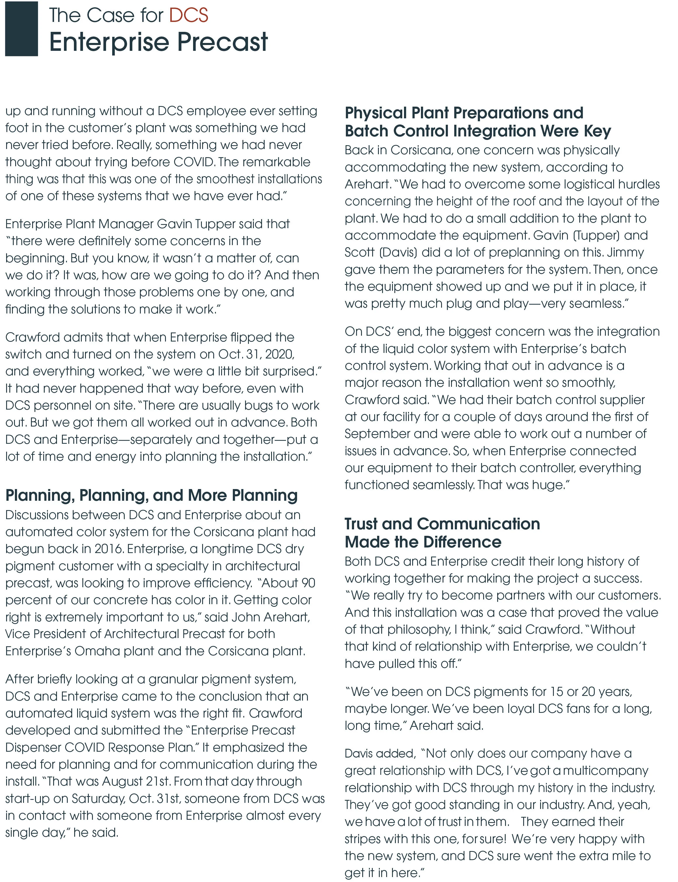 Our newest case study in our series “The Case for DCS” series tells the story of how DCS has partnered with Enterprise Precast in Corsicana, TX, to build and install a liquid color dispensing system amidst a global pandemic.